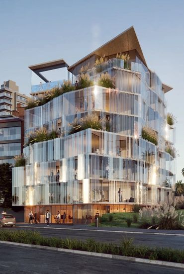Se trata de un edificio con fachada facetada dinámica de geometría compleja, formado por lamas de vidrio móviles con distintos tratamientos que pivotan y permiten generar diferentes grados de apertura de la fachada, controladas por la incidencia solar, transformando la apariencia del edificio en los diferentes momentos del día.